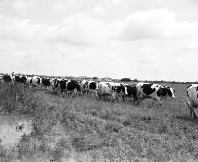 Image shows herd of Holstein cows on John Williams ranch, near Iowa Park. Published in the Fort Worth Star-Telegram morning edition, August 6, 1950.