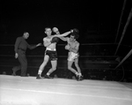 Fort Worth's Leonard Smith, left, and Tony Ramirez of San Antonio swap hard punches in flyweight battle as the State Golden Gloves Tournament, sponsored by the Star-Telegram, opened at Will Rogers Coliseum. Ramirez was the winner on a decision. Published in Fort Worth Star-Telegram evening February 18, 1954.
