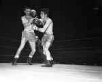 Middleweights John (Cheeta) White of Dallas, left, and Bill Glosson of Houston tangle at the State Golden Gloves. White won decision. Published in Fort Worth Star-Telegram evening February 19, 1954.