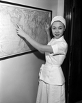 Dr. Kumsum Ryu, part of Harris Hospital's UN, points at a world map. Published in Fort Worth Star-Telegram evening edition February 18, 1954.
