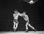 Baltazar Flores Jr. of Beaumont lands right to head of Frank Williams of Wichita Falls. Flores won on decision in bantam bout at the State Golden Gloves. Published in Fort Worth Star-Telegram morning February 20, 1954.
