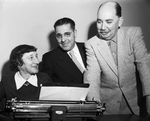 Early arrivals for the Western Territorial Conference of the International Stewards and Caterers Association at Hilton Hotel were L. J. Mondau, center, president of the Tacoma, Washington branch, and T. Kent Morris, right, international executive secretary. Taking their registrations is Mrs. Gertrude Davidenko. Published in Fort Worth Star-Telegram evening edition February 19, 1954.