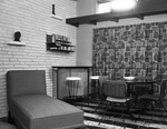 Comfort and informality are features of this hospitality room in the Baird Tripps' house in Meadowbrook Hills. The club loafer to the left is one of two, and both convert to twin beds for overnight guests. The wrought iron table and snack bar make entertaining easy. Published in Fort Worth Star-Telegram evening edition February 19, 1954.
