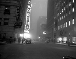 A brown blizzard turned daylight to darkness Friday afternoon in Fort Worth. This photo taken at the height of the dust and wind, shows the poor visibility at the corner of 7th and Taylor. The wind velocity was from 30 to 38 miles an hour with gusts up to 52. Published in Fort Worth Star-Telegram morning edition February 19, 1954.