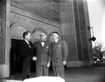 Leroy C. Jennings, left, finance chairman, and E. A. Shepperd, center, building committee chairman, for the new Baptist Church Sanctuary, Abilene, are shown with their pastor, Reverend Elwin L. Skiles, right. Published in Fort Worth Star-Telegram evening edition February 20, 1954.