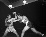 Pete Perez, right, is trying desperately to rescue the decision in the third round while the alert George Villa counters with a left at the State Golden Gloves. Villa won on points. Published in Fort Worth Star-Telegram morning February 22, 1954.
