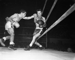 Tony Ramirez of San Antonio lands left as he sends Amarillo's Elmo Sams into ropes during fly weight scrap on Star-Telegram's State Golden Gloves program. Ramirez earned decision. Published in Fort Worth Star-Telegram morning February 23, 1954.
