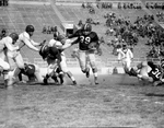 Freshman Fullback Buddy Dike (39) follows blocking of Halfback Harold Pollard to good yardage during intrasquad game at Amon Carter Stadium. It ended TCU's spring drills. Published in Fort Worth Star-Telegram morning edition February 21, 1954.