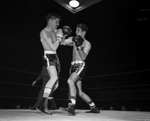 Dickie Don Wood, left, of Wichita Falls and Scott Sherman, Fort Worth native fighting for Brownwood, parry at close range at the Star-Telegram Golden Gloves state tournament.. Sherman won decision. Published in Fort Worth Star-Telegram evening February 21, 1954.