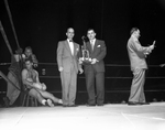 Bob Bethea, left, of the Star-Telegram's Golden Gloves staff, with Bill Bellamy, San Antonio gloves director whose squad won the state team title Monday night for the second straight year pose with a trophy. In the background is a boxer in the corner with coaches Published in Fort Worth Star-Telegram morning February 23, 1954.