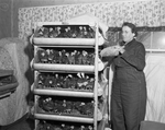 Ranch and Farm on 4-H work at Kennedale. Mrs. W. J. Vincent of Godley feeds her Black Beauty turkey poults, which are kept in this battery broader for two weeks.