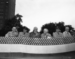 Men sit on stage at the ringing of the Liberty Bell in Burk Burnett Park.