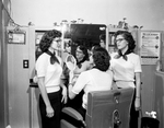 Triplets from Maddox Avenue Home admire the permanents they received free from Westcliff Beauty Salon as part of National Beauty Salon Week. Left to right are Charline, Maxine, and Claudine Lancaster, 17. Published in Fort Worth Star-Telegram morning edition February 24, 1954.