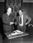 Brigade General John W. Naylor, left, assistant commander of the 49th Armored Division, Texas National Guard, receives the deed to a block square site on the South Side for a new $160,000 armory from J. E. Foster Jr. in the latter's office. A scale model of building to be erected is shown on the desk. Published in Fort Worth Star-Telegram evening edition February 23, 1954.