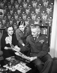 Chaplain Emil A. Zund, a former pastor of Grapevine Baptist Church and now an Army Lieutenant-Colonel on 30-day leave here, joins his wife and son, Joe David, in examining some of the pictures made during his recently ended tour of duty with the Korea Military Advisory Group. Published in Fort Worth Star-Telegram evening edition February 23, 1954.