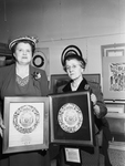 Mrs. Nelson Leonard, left, and Mrs. R. H. McLemore Jr. with framed Texas Centennial mementoes. Published in Fort Worth Star-Telegram evening edition February 25, 1954.