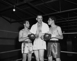 Ricardo Lara, left, and Armando Quintana, right, help Heavyweight Lloyd Thorton with his gloves at the Golden Gloves-National Guard Gymnasium as the three of them workout a exercise drill. Lara, a flyweight, and Quintana, a lightweight, both are from El Paso. Thorton is from Fort Hood. The three, along with five other Texas representatives, will leave for Chicago. Published in Fort Worth Star-Telegram morning February 23, 1954.