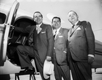 Governor Frank Clement of Tennessee, left, leaves Carter Field for the annual Snyder Chamber of Commerce banquet, with Phil Regan, center, Irish singer, and C. T. McLaughlin, Synder oil man. Published in Fort Worth Star-Telegram evening edition February 26, 1954.