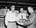 Bill Martin, left, and L. G. (Buddy) Stevenson, center, Wyatt Food Store managers, receive checks totaling $1,250 from W. B. Wiley, city sales manager for Swift & Company. Martin and Stevenson won awards for their displays of Swift products. Published in Fort Worth Star-Telegram evening edition February 26, 1954.