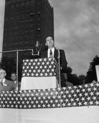 Governor Allan Shivers speaks into a microphone at the ringing of the Liberty Bell in Burk Burnett Park.
