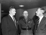 British General Sir Frank E. W. Simpson and Bert Simmons, right, British consul at Dallas, receive a Fort Worth welcome from Bob Loughridge, president of the Optimist Club. General Simpson addressed the club at a luncheon in the Hotel Texas Hall of Exhibits. Published in Fort Worth Star-Telegram evening edition February 26, 1954.