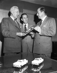 Charles I. Kenney, left, of Dallas, district sales manager of Ford Motor Company, presents the company's highest award for dealership operation to Basil Roper, and K. K. Kellam of Texas Motors. Published in Fort Worth Star-Telegram evening edition February 26, 1954.