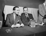 Governor Shivers, left, and Governor Johnston Murray of Oklahoma attended the Young Democrats convention at Mineral Wells. Murray spoke Friday night and Shivers was scheduled to speak Saturday afternoon. Published in Fort Worth Star-Telegram morning edition February 26, 1954.