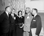 Leading figures at the convention of the Young Democrats at Mineral Wells gather. Left to right, Associate Justice Will Willson of the Texas Supreme Court, State Senator, Searcy Bracewell of Houston, State Representative, Dorothy Gurley of Del Rio, George Sandlin of Austin, secretary of the state Democratic committee, and Attorney General Shepperd. Published in Fort Worth Star-Telegram morning edition February 27, 1954.