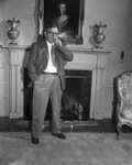 A photograph of Clint Murchison Junior standing in front of fireplace smoking a cigar. 02/27/1954