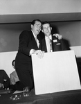 Singer Phil Regan, left, and Jim W. McCormick of Wichita Falls, newly elected president of the Young Democrats, join in a duet for the amusement of delegates. Published in Fort Worth Star-Telegram morning edition February 27, 1954.