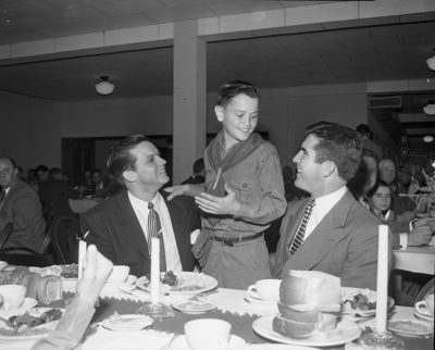 Charlie Reed, 13, William James Junior High School boy from Tarrant County Home, tells his athletic aspirations to Jackie Robinson, left, former Paschal High School and Baylor University basketball star, and Lindy Berry, Texas Christian University gridiron ace. The picture was taken at a Polytechnic Baptist Church Men's Brotherhood banquet. Published in Fort Worth Star-Telegram edition, May 17, 1950.