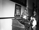 Jim Sutton, third grader at Alexander Hogg Elementary School, shows his father, M. H. Sutton, right, and A. M. Blissit, left, a picture of Alexander Hogg while Blissit's son, Ray Breshers, looks on. The two fathers were hosts at the school Monday for the opening of Public Schools Week. Published in Fort Worth Star-Telegram evening edition March 1, 1954.