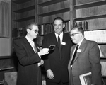 J. A. Gooch, center, president of the Fort Worth Heart Association, examines a slide shown by Dr. Rodolfo Limon-Lason of Mexico City, left, in a talk at the Academy of Medicine. Dr. Demetrio Sodi-Palleres, also of Mexico, is on the right. Published in Fort Worth Star-Telegram evening edition March 1, 1954.