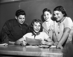 Making plans for a Young Judea sectional convention which will open here Friday afternoon are these officers of the local group: Sandra Berkowitz, president, seated. Standing, left to right, David Garsek, vice president, Marvin Lesser, treasurer, and Brenda Labovitz, secretary. Published in Fort Worth Star-Telegram morning edition March 1, 1954.
