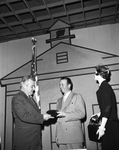 Stuart Lydick, right, members of the Board of Education, presents a plaque to James Cook of The Fair's display department. Cook received the award for winning first place in the Public Schools Week window display contest. Behind the men is a red school house, high point of The Fair's display. Published in Fort Worth Star-Telegram evening edition March 3, 1954.