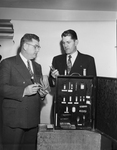 Judge Drew Clifton, left, holds a jar of "reefers", cigarettes made from marijuana leaves, while Police Chief Cato Hightower explains that his jar contains the pulverized narcotic weed, ready to be rolled into the habit-forming smokes. The judge will speak on the current local narcotics problem. Published in Fort Worth Star-Telegram morning edition March 3, 1954.