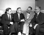 Members of the Fort Worth and Dallas Retail Furniture Dealers Associations met at Carter Field to honor state and national association presidents. They are, left to right, T. B. McLain, president of the Dallas group; C. Cree Gable of Muncie, Indiana, president of the National Retail Furniture Association; and Will Ed Kemble, president of the Fort Worth group. Published in Fort Worth Star-Telegram morning edition March 4, 1954.