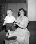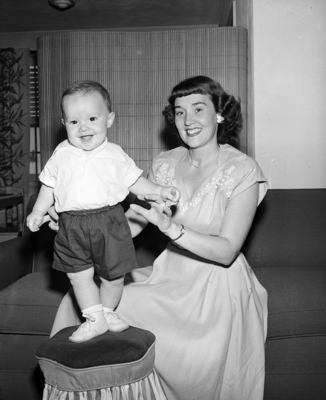 Mrs. Locile Marie Bratton, wife of William A. Bratton Junior, of 3106 Darnell, was installed as president of the Cecilian Club. With her is her 8-month-old, William Albert III. Published in Fort Worth Star-Telegram evening edition May 19, 1950.