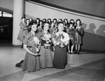 These Tarrant County Girl Scouts opened Girl Scout Week observance with choral ceremonies at the Children's Museum. In foreground, holding candle, fruit, and an urn, left to right, are Patty Bordeno, Carolyn Conrad, and Barbara Sparrow. Published in Fort Worth Star-Telegram evening edition March 7, 1954.