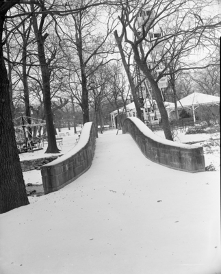 Not even the Ferris wheel in Forest Park's playground escaped the drapery of ice and sleet which covered everything from the stone approach bridge to the tops of the wheel's gondolas. Not a person was in sight, not even a squirrel. A bridge and trees with snow on the trees and ground.