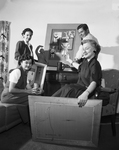 Member of Art Education Association are shown here discussing the problems of hanging their annual exhibition which opens Sunday at 3 p.m. in the TCU art gallery. Seated, left, is Miss Norma Jean McClure and standing is Miss Norma Adams, chairman of the event. Standing, right, is Ed Curry and seated is Miss Doris Moore, AEA president. Published in Fort Worth Star-Telegram morning edition March 9, 1954.