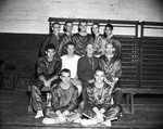 Poly Methodist, Fort Worth's City Church League basketball champions are, left to right, bottom row, Jimmy Brown, Gerland Baum, second row, Delaney James, Manson Pritchard, Team Manager R. A. Caraway, Ed Moody, standing, Sam Adams, Ray Ainsworth, Kendall Bond, Bill Weatherly, and Tony Hernandez. Published in Fort Worth Star-Telegram morning edition March 9, 1954.