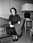 Mrs. Joy Walker White, 6131 Curzon, will leave soon accompanied by her daughter, Joy Lina White, not pictured, to spend the summer traveling in Europe. Her daughter attends the Hockaday School in Dallas. A woman smiling sitting down wearing a black dress.