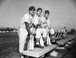 The three players, Nick Georges, Jerry Culver and Norman Ashley, left to right, are operating in the outfield for Arlington Heights High School. Published in Fort Worth Star-Telegram morning edition March 18, 1954.