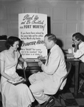 Miss Mary Lou Cooper, of 717 Griggs Ave., a Pioneer Airlines stewardess whose work takes her out of the city most of the time, made sure she would be counted as a Fort Worth resident by registering with Charles Harrington at the census booth in the Chamber of Commerce. Published in Fort Worth Star-Telegram edition, May 18, 1950.