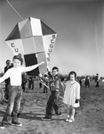 Earl Geis, 10, son of Mr. and Mrs. John Geis, holds his tiny kite in front of the big one held by Ted DeLorme, and his sister, Kay, 5, children of Mr. and Mrs. W. C. DeLorme. The kites were entries in Yucca district cub scouts contest. Published in Fort Worth Star-Telegram morning edition March 12, 1954.