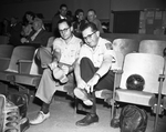 J. W. Stevenson, left, and Johnny Powell of Houston tie shoelaces before rolling in 23rd state bowling tournament at Bowlanes. Published in Fort Worth Star-Telegram morning edition March 12, 1954.