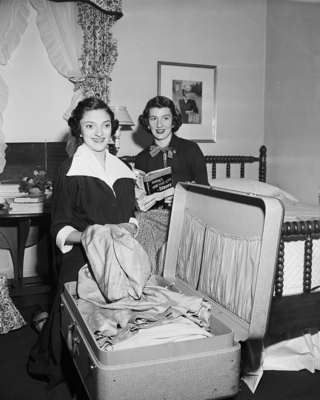 Two Anns, Ann Graham, left, and Ann Fisher will meet in New York June 5 to sail on the SS Caronia on a two and a half month European tour. They will return to their homes here the first of September. Published in Fort Worth Star-Telegram morning edition, May 28, 1950.