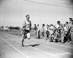 Jim Knox crosses finish line to give Graham first-place victory in 440-yard relay of Cowtown Relays. Time was 44.6 seconds. Published in Fort Worth Star-Telegram evening edition April 3, 1954.