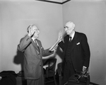 U.S. Commissioner Robert F. Milam, right, who has held that post since 1942, was sworn in for a new four-year term Monday by U.S. District Clerk George W. Parker. Judge Milam's new commission was signed by Federal Judge Davidson. Published in Fort Worth Star-Telegram morning edition March 15, 1954.
